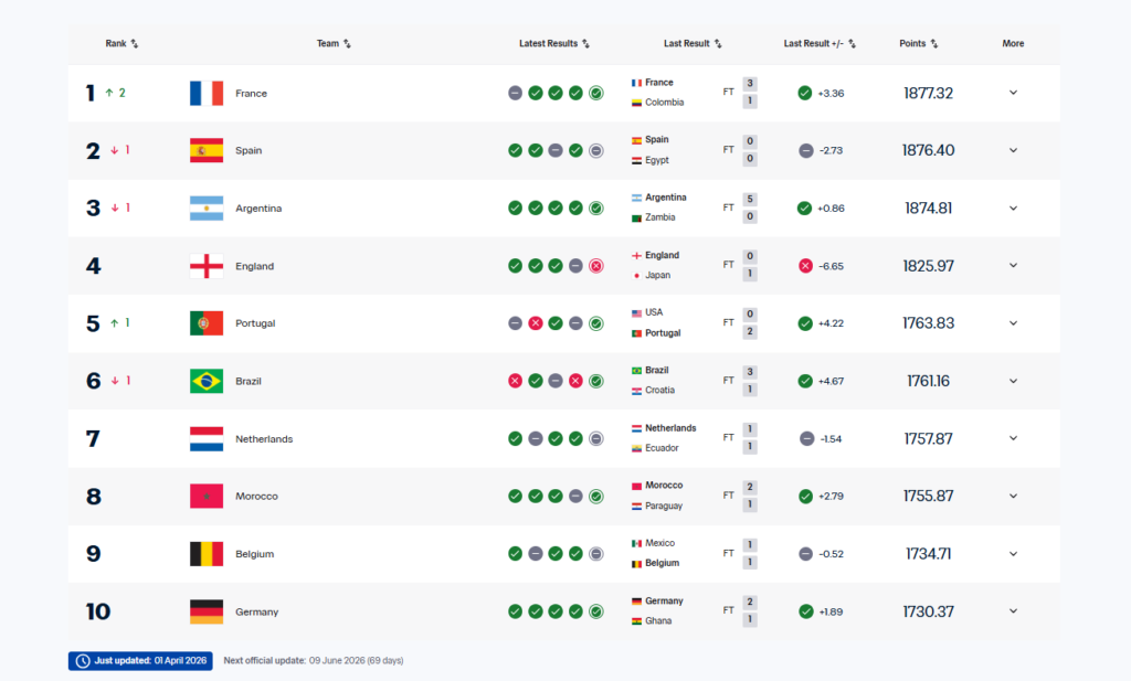 La actualización del Ranking FIFA 2026 confirma un cambio de guardia en la parte más alta. “La Roja”, dirigida por Luis de la Fuente, pagó caro su empate sin goles ante Egipto, perdiendo los puntos necesarios para mantenerse en la cima. España ahora suma 1,876.40 unidades, quedando apenas por debajo de los galos.